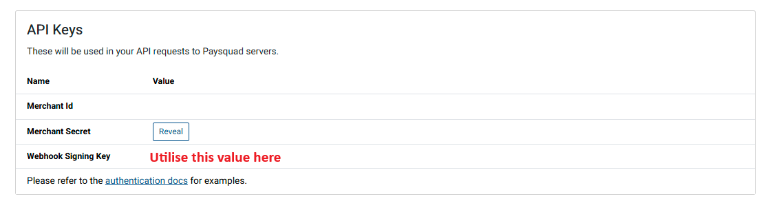 Use your webhook signing key (available in the Paysquad merchant dashboard under Developer -> API Keys):